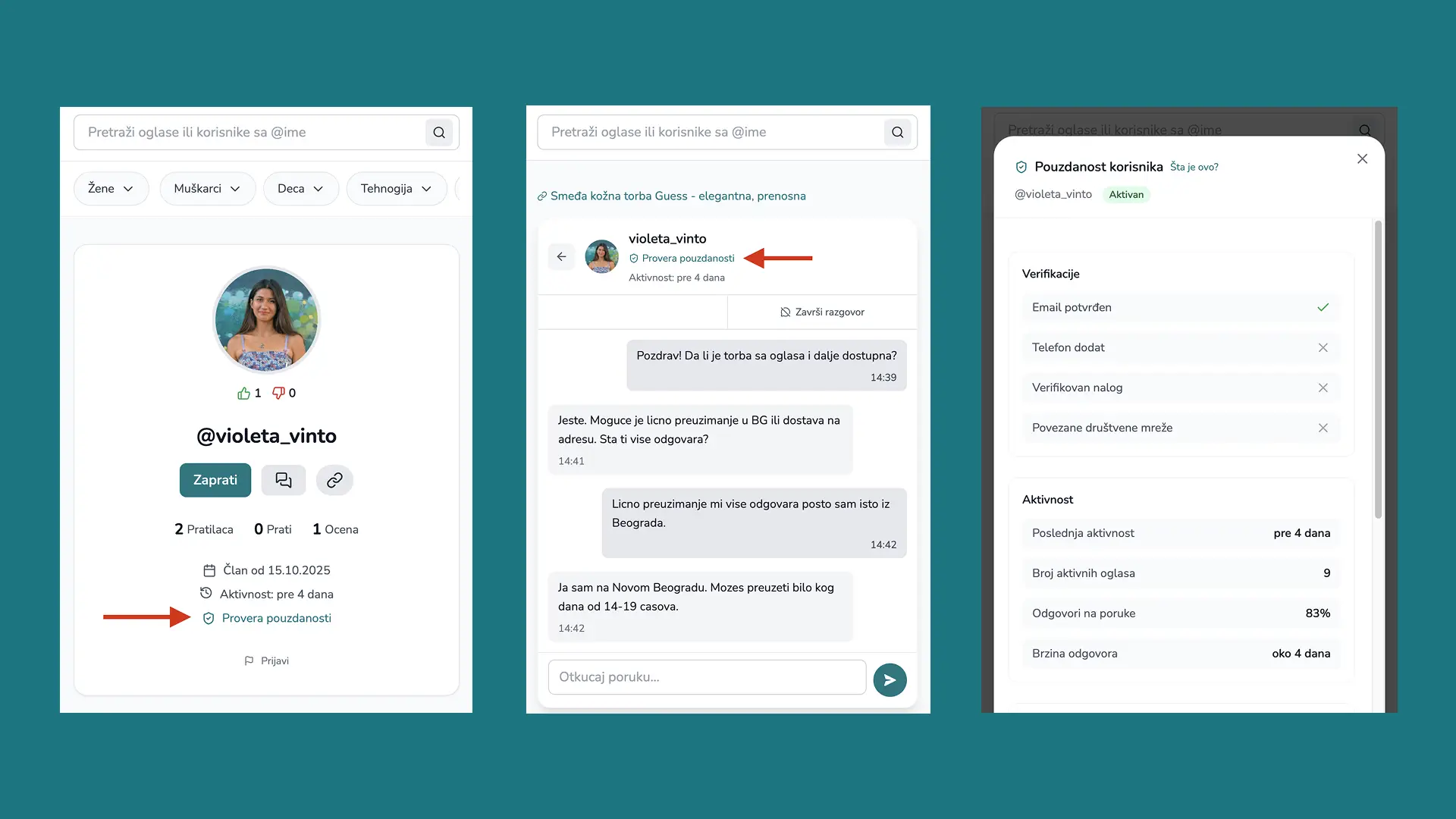 Radi unapređenja bezbednosti i transparentnosti na platformi, uveli smo funkcionalnost „Provera pouzdanosti korisnika“. Ova opcija omogućava da na jasan i pouzdan način procenite nalog drugog korisnika pre nego što stupite u komunikaciju ili transakciju.